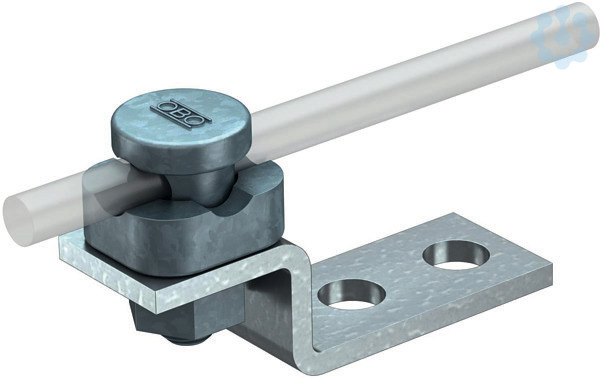Verbindungsklemme - Mit 2 Anschlusslöchern Ø 11 mm - Montiert mit Verbinder (einteilig) 5001 DIN - Entspricht den Anforderungen nach DIN VDE 0185-305-3 Passung: Rd 8-10 Werkstoff: Stahl Gewicht: 14,5 kg/100 St. Typ: 5009 Art.-Nr.: 5304970