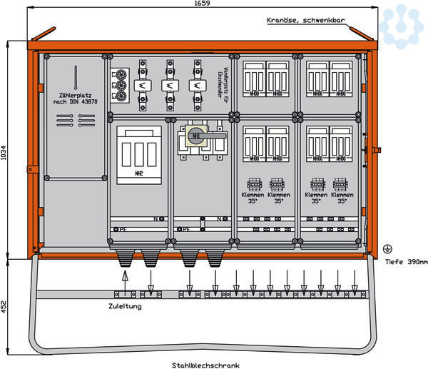 inkl. feuerverzinktem Untergestell mit Ösen für Erdnägel Einbauten im Isolierstoffgehäuse Schutzart : IP 44 Messeinrichtung Schutzart : IP 54 Größe ca.: 1034 x 1659 x 390mm / H-B-T + Untergestell-Höhe ca.: 452mm