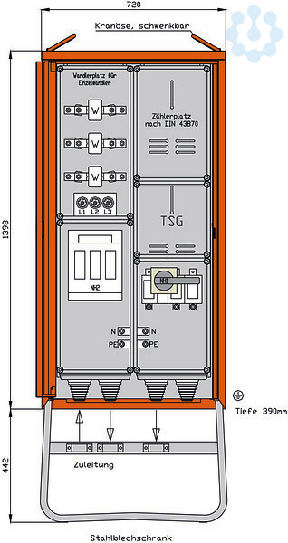 inkl. feuerverzinktem Untergestell mit Ösen für Erdnägel Einbauten im Isolierstoffgehäuse Schutzart : IP 44 Messeinrichtung Schutzart : IP 54 Größe ca.: 1398 x 720 x 390mm / H-B-T + Untergestell-Höhe ca.: 442mm