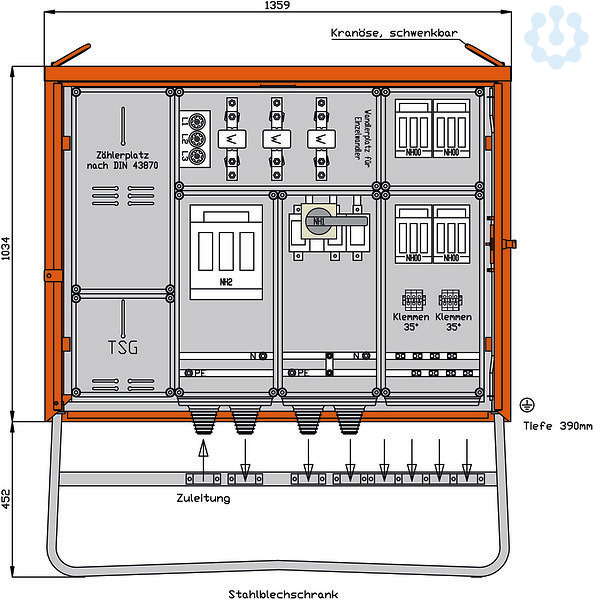inkl. feuerverzinktem Untergestell mit Ösen für Erdnägel Einbauten im Isolierstoffgehäuse Schutzart : IP 44 Messeinrichtung Schutzart : IP 54 Größe ca.: 1034 x 1359 x 390mm / H-B-T + Untergestell-Höhe ca.: 452mm