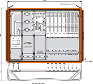 inkl. feuerverzinktem Untergestell mit Ösen für Erdnägel Einbauten im Isolierstoffgehäuse Schutzart : IP 44 Messeinrichtung Schutzart : IP 54 Größe ca.: 1371 x 1850 x 480mm / H-B-T + Untergestell-Höhe ca.: 442mm