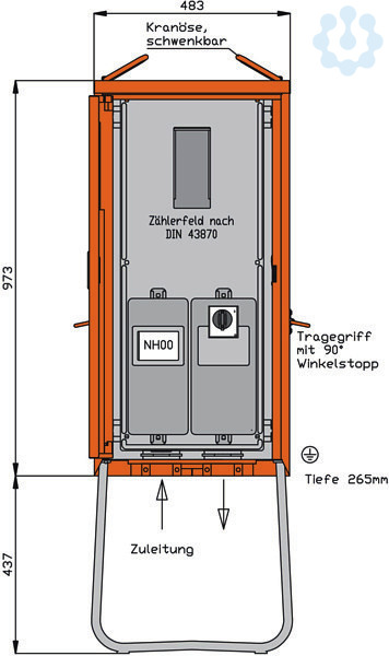 inkl. feuerverzinktem Untergestell mit Ösen für Erdnägel Einbauten im Isolierstoffgehäuse Schutzart: IP 44 Messeinrichtung Schutzart: IP 54 Größe ca.: 973 x 483 x 265mm / H-B-T + Untergestell-Höhe ca.: 437mm