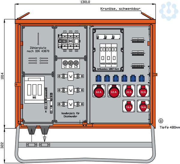 mit Kranösen Einbauten bis einschließlich RCD-Schutzschalter im Isolierstoffgehäuse Schutzart: IP 44 Messeinrichtung Schutzart: IP 54 Größe ca.: 1014 x 1301 x 480mm / H-B-T