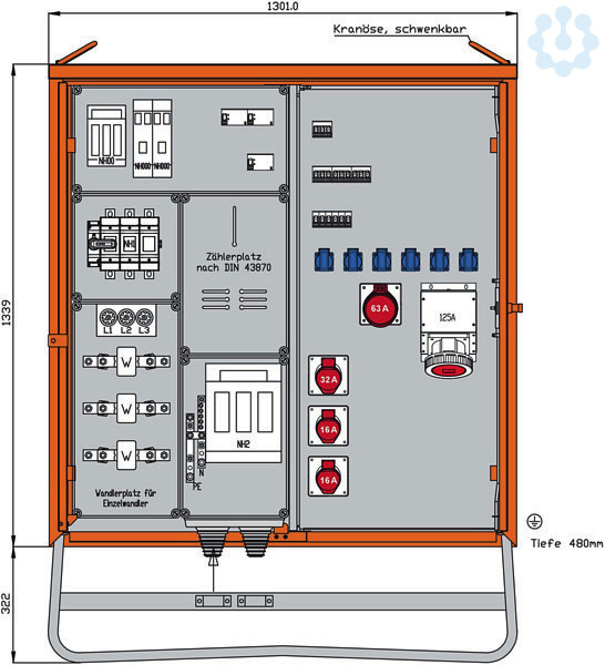 inkl. feuerverzinktem Untergestell mit Ösen für Erdnägel Einbauten bis einschließlich RCD-Schutzschalter im Isolierstoffgehäuse Schutzart: IP 44 Messeinrichtung Schutzart: IP 54 Größe ca.: 1339 x 1301 x 480mm / H-B-T