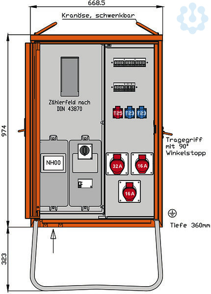 Einbauten bis einschließlich RCD-Schutzschalter im Isolierstoffgehäuse Schutzart: IP 44 Messeinrichtung Schutzart: IP 54 Größe ca.: 974 x 669 x 360mm / H-B-T