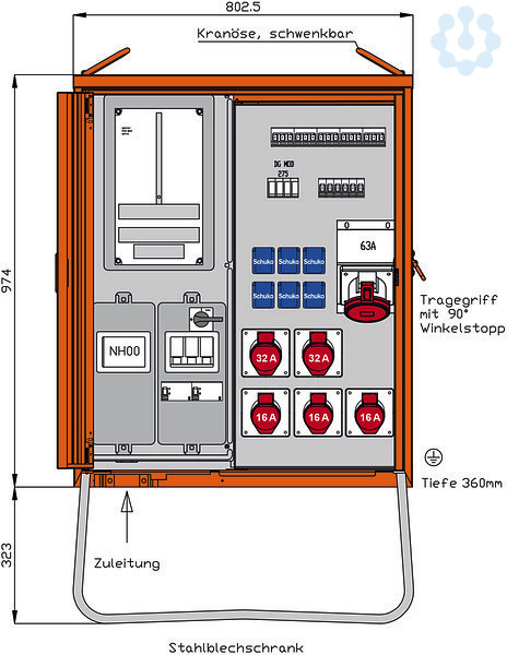inkl. feuerverzinktem Untergestell mit Ösen für Erdnägel Einbauten bis einschließlich RCD-Schutzschalter im Isolierstoffgehäuse Schutzart : IP 44 Größe ca.: 974 x 803 x 360mm / H-B-T + Untergestell-Höhe ca.: 323mm