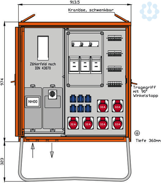 Einbauten bis einschließlich RCD-Schutzschalter im Isolierstoffgehäuse Schutzart: IP 44 Messeinrichtung Schutzart: IP 54 Größe ca.: 974 x 914 x 360mm / H-B-T