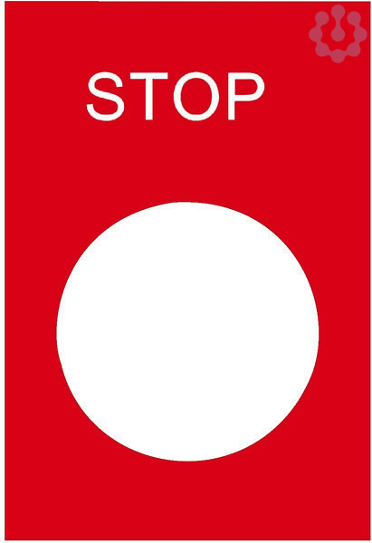 Beschriftete Bezeichnungsschild mit 30 x 40 mm, die mit STOP-Buchstaben gekennzeichnet ist. Es ist ein Zubehör der Baureihe Harmony XAC Hängetaster für 22-mm-Kunststoff-Signaleinheiten mit Durchmesser.