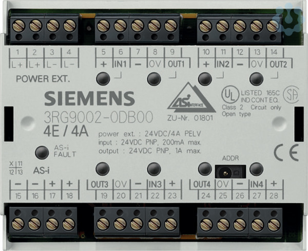 AS-Interface Modul F90, digital 4DI/4DQ, IP20 4 x Eingang für 3-Leiter Sensor externe Sensorversorgung 4 x Ausgang, 2 A, DC 24 V maximal 6 A für alle Ausgänge Anschluss über Schraubklemmen Baubreite 90 mm