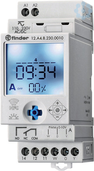 Elektronische Astro-Zeitschaltuhr mit Wochenprogramm für Reiheneinbau, 1 analoger Ausgang: 0-10 V oder PWM, 1 Wechsler für 16 A / 250 V AC (AC1), Versorgungsspannung: 110-230 V AC/DC, LCD-Anzeige, Joystick-Programmierung oder Programmierung über ein NFC-fähiges Smartphone mit der Finder Toolbox-App (Android und iOS). Nach Installation der Finder App kann ein bestehendes Programm ausgelesen werden oder eine Neuprogrammierung mit maximaler Flexibilität erfolgen. Zum Übertragen der Daten wird die Zeitschaltuhr mit dem Smartphone berührt. Astronomische Zeitsteuerung durch automatisches Schalten bei Sonnenauf- und Sonnenuntergang über Postleitzahl oder Ortskoordinaten, wählbarer Zeitversatz der Sonnenauf- und Sonnenuntergangszeit sowie Ein- und Ausschalten während der Astro-Einschaltzeit. Kontaktmaterial AgSnO2, max. Einschaltstrom 120 A für 5 ms, kürzeste Schaltzeit 1 Minute. Max. Schaltleistung bei 230 V AC1: 4000 VA, kompatibel mit Netzteilen/Vorschaltgeräten mit 0-10 V oder PWM Eingängen oder Slave-Dimmern vom