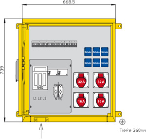 Abgang / Absicherung: 1 RCD-Schutzschalter 4P 63A/30mA -A- 2 CEE-Anbaudosen 32A 5P 400V 6h