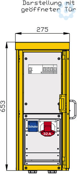 Abgang / Absicherung: 1 RCD-Schutzschalter 4P 40A/30mA -A- 1 CEE-Anbaudose 32A 5P 400V 6h