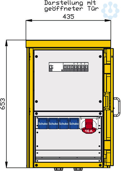Abgang / Absicherung: 1 RCD-Schutzschalter 4P 40A/30mA -A- 1 CEE-Anbaudose 16A 5P 400V 6h
