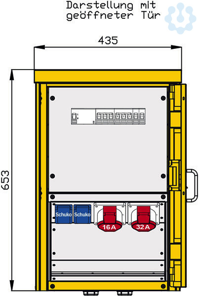 Abgang / Absicherung: 1 RCD-Schutzschalter 4P 63A/30mA -A- 1 CEE-Anbaudose 32A 5P 400V 6h