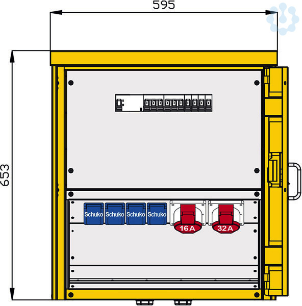 Abgang / Absicherung: 1 RCD-Schutzschalter 4P 63A/30mA -A- 1 CEE-Anbaudose 32A 5P 400V 6h