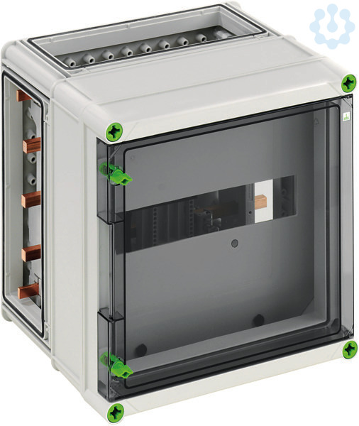 Automatengehäuse, Industrie Qualität, 14 Teilungseinheiten, 1-reihig, serienmäßig plombierbar, mit Sammelschienensystem 5-polig 250A, Sammelschieneneinspeisung 70/35qmm und Adapter zum Einbau eines selektiven Hauptschalters, Abdeck- und Beschriftungsstreifen, 3 x Gehäuseverbinder (GGV), mit transparenter Klapptür
