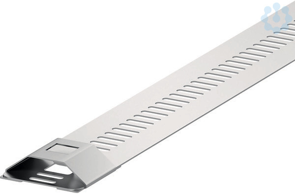 Schmele Bandschelle aus Metall in Leiterform mit Einfachschloss. Zur hochtemperatur- und witterungsbeständigen Fixierung von Brandschutzbandagen für Kabeltrag-Systeme.