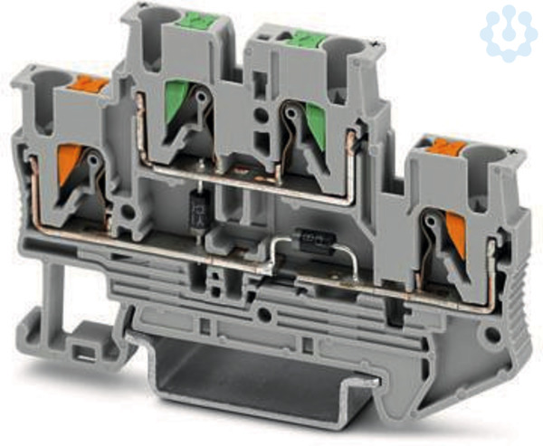 Bauelementreihenklemme, mit integrierter Diode 1N4007, Der max. Strom wird durch die Diode bestimmt. Eingebaut: Diode 1N 4007, Sperrspannung: 1300 V, Dauergrenzstrom: 0,5 A., Nennspannung: 500 V, Nennstrom: 0,5 A, Anschlussart: Push-in-Anschluss, Anzahl der Anschlüsse: 4, Querschnitt: 0,14 mm² - 4 mm²,