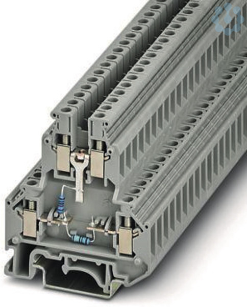 Bauelementreihenklemme, mit zwei eingelöteten Widerständen 1,4 kOhm und 10 kOhm, Nennspannung: 500 V, Nennstrom: 32 A, Anschlussart: Schraubanschluss, Anzahl der Anschlüsse: 4, Querschnitt: 0,2 mm² - 4 mm²,