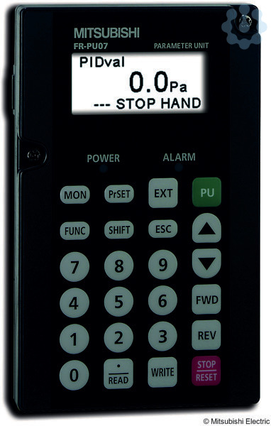 Neben den Funktionen der Standard-Bedieneinheit können mit Hilfe der Bedieneinheit insgesamt 21 verschiedene Werte und Zustande angezeigt und überwacht werden. Die Bedieneinheit wird anstelle der Standard-Bedieneinheiten FR-DU04 und FR-DU07 verwendet. Sie kann nach Gebrauch wieder gegen diese ausgetauscht werden. Die Bedieneinheit erfüllt die Schutzart IP40.