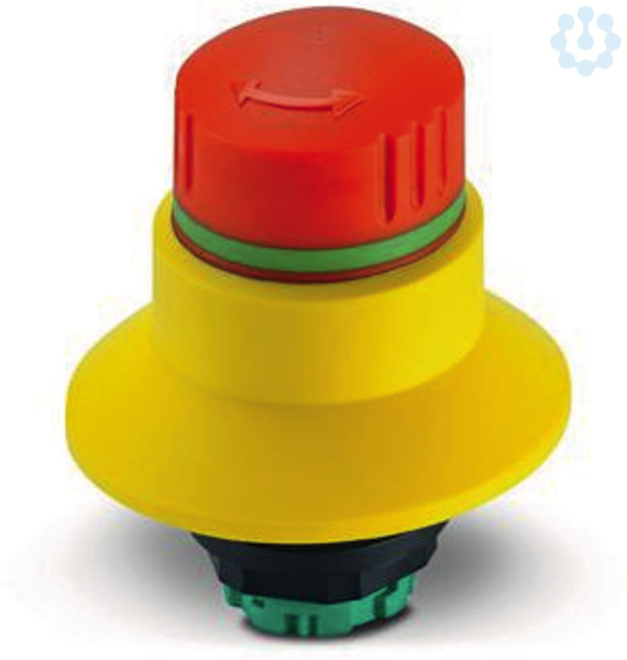 Betätiger mit Blockierschutzkragen für modulare Not-Halt-Schalter, für die Kombination mit Modulhalter und Kontaktgeber als funktionsfähige Einheit, Frontplattenmontage, Bajonettverschluss