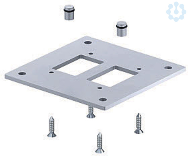 Bodenplatte zur Befestigung der ISS-Indutriesäule auf dem Boden. Im Lieferumfang enthalten sind 4 Befestigungsschrauben zur Montage der Bodenplatte am Säulenprofil und 2 Dichtstopfen zum luftdichten Verschliessen der Druckluftkanäle.