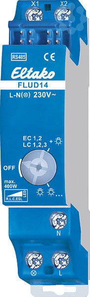 Leistungszusatz für Dimmschalter FUD14/800W, Power MOSFET bis 400W. Stand-by-Verlust nur 0,1 Watt. Reiheneinbaugerät für Montage auf Tragschiene. An die Universal-Dimmschalter FUD14/800W können Leistungszusätze FLUD14 angeschlossen werden, wodurch sich die Schaltleistung abhängig von den Lüftungsverhältnissen für eine Leuchte um bis zu 200W, für zusätzliche Leuchten um bis zu 400W, je Leistungszusatz erhöht. Die beiden Schaltungen für die Leistungserhöhung können mit mehreren FLUD14 gleichzeitig ausgeführt werden. Versorgungsspannung 230V. Keine Mindestlast erforderlich. Automatische elektronische Überlastsicherung und Übertemperaturabschaltung. Die Lampenart eines Leistungszusatzes FLUD14 kann in der Schaltung Leistungserhöhung mit zusätzlichen Leuchten von der Lampenart des Universal-Dimmschalters FUD14/800W abweichen. Dadurch ist es möglich kapazitive Lasten und induktive Lasten zu mischen. Es ist ein Lüftungsabstand von 1/2 Teilungseinheit zu daneben montierten Geräten einzuhalten.