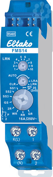 Multifunktions-Stromstoß-Schaltrelais, 1+1 Schließer potenzialfrei 16A/250V AC, Glühlampen 2000W, mit DX-Technologie. Bidirektional. Stand-by-Verlust nur 0,1-0,6 Watt. Reiheneinbaugerät für Montage auf Tragschiene. Anschluss an den Eltako-RS485-Bus. Querverdrahtung Bus und Stromversorgung mit Steckbrücke. Hierzu einfach den N-Leiter an die Klemme (N) und L an K(L) anschließen. Dadurch ergibt sich ein zusätzlicher Stand-by-Verlust von nur 0,1 Watt. Maximalstrom als Summe über beide Kontakte 16A bei 230V. Beim Ausfall der Versorgungsspannung wird definiert ausgeschaltet. Sind die 2 Relais des FMS14 eingeschaltet, werden 0,6 Watt benötigt. Mit dem oberen und dem mittleren Drehschalter werden die Sensoren eingelernt. Für den Normalbetrieb werden der mittlere Drehschalter anschließend auf AUTO und der untere Drehschalter auf die gewünschte Funktion gestellt. Die LED unter dem oberen Drehschalter begleitet den Einlernvorgang gemäß Bedienungsanleitung und zeigt im Betrieb Steuerbefehle durch kurzes Aufblinken an.