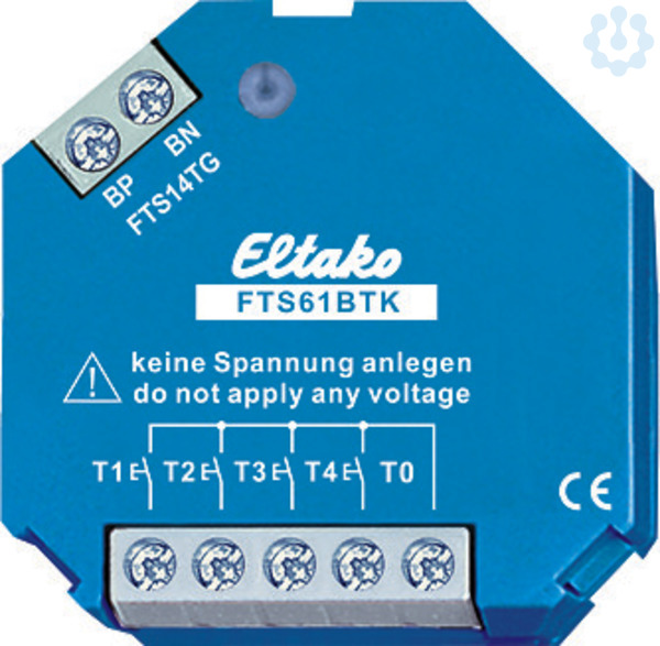 Bus-Tasterkoppler für 4 konventionelle Taster zum Anschluss an Taster-Gateways FTS14TG. Stand-by-Verlust nur 0,2 Watt. Für Einbaumontage. 45mm lang, 45mm breit, 18mm tief. Bis zu 30 Bus-Taster und/oder Bus-Tasterkoppler FTS61BTK können über die Busleitung an ein Taster-Gateway FTS14TG angeschlossen werden. Das dem FTS14TG beiliegende RLC-Glied muss an dem am weitesten entfernten Bus- Taster bzw. Bus-Tasterkoppler zusätzlich an die Klemmen BP und BN angeschlossen werden. Bitte nur gängige Bus- oder Telefonleitungen verwenden. Die Stromversorgung erfolgt von dem FTS14TG. Mit einer maximalen Leitungslänge von 2 Metern können bis zu vier konventionelle Taster an T1, T2, T3, und T4 angeschlossen werden. Als Richtungstaster können die Paare T1/T3 und T2/T4 definiert werden. Der Gegenpol ist jeweils die Klemme T0. Der Bus wird an BP und BN angeschlossen. Polarität beachten! Die LED leuchtet grün, sobald die Versorgungsspannung über den Bus anliegt und eine Geräteadresse vergeben wurde.