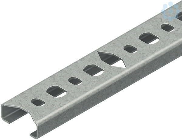 Reihenschiene Modell 2910, C-Profil ähnlich DIN EN 60715, mit querliegender Abbrechlochung. Passende Bügelschellen (BA... und BAK...) können nur vom Profilende aus eingeschoben werden.