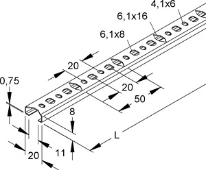 Reihenschiene Modell 2910, C-Profil ähnlich DIN EN 60715, mit querliegender Abbrechlochung. Passende Bügelschellen (BA... und BAK...) können nur vom Profilende aus eingeschoben werden.