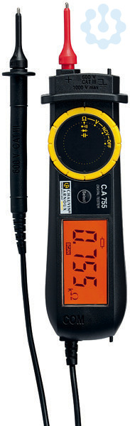 Beschreibung Der C.A 755 ist ein leichtes, gut in der Hand liegendes und bedienungsfreundliches Gerät in Schutzart IP54. Es ist gegen Staub und Fallhöhen bis zu 2 m geschützt. Auf seiner beleuchteten 3000 Digit-Anzeige sind die Messwerte direkt ablesbar. Der Spannungsprüfer C.A 755 ist das ideale Gerät für Elektriker, Heizungs- und Klimatechniker, Mechaniker, Wartungstechniker usw? Er ermöglicht das Arbeiten in völliger Sicherheit: - doppelte Isolation - geschützt gegen Spannungsspitzen bis 6 kV - geschützt bis 1000 V bei Durchgangsprüfungen, Widerstands- und Kapazitätsmessungen - kontaktlose Spannungserkennung - Anzeige von gefährlich hohen Spannungen - automatische Abschaltung nach 10 Minuten Nichtbenutzung