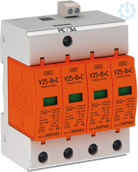 Blitzstrom- und Überspannungsableiter V25-B+C, Typ 2 + 3 nach EN 61643-11 (Klasse B+C nach VDE 0675), 3-polig für TN-C- bzw. 4-polig (3+NPE) für TN-S und TT-Netze. Anschlussfertiger Kombi-Ableiter, steckbare Kompletteinheit mit thermischer und dynamischer Abtrennvorrichtung und optischer Funktionsanzeige. Multibase-Unterteil mit Doppelklemmen für Leiter und Kammschiene. Version -FS mit integriertem potentialfreiem Fernmeldekontakt. Schutzpegel < 0,9 kV, max. erforderliche Vorsicherung 160 A. Gekapselte, nicht ausblasende Varistorableiter bzw. Funkenstrecke. 5 Jahre Gewährleistung