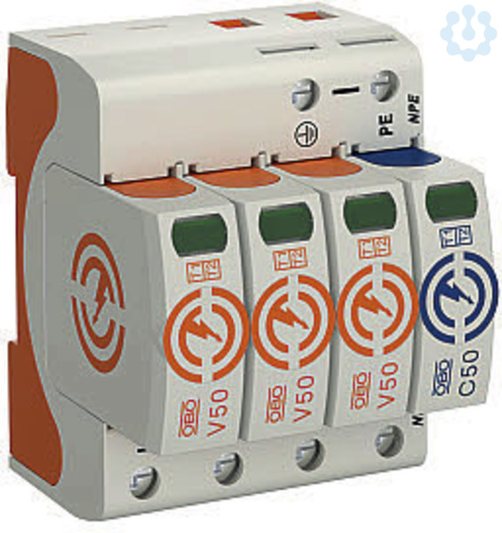 Der V50 Blitzstrom-Kombiableiter aus halogenfreiem Kunststoff eignet sich für einen Blitzschutz-Potentialausgleich nach VDE 0185-305 (IEC 62305). Eine dynamische Abtrennvorrichtung und optische Statusanzeige zeichnen die modular steckbaren Ableiter aus. Die NPE-Variante ist zusätzlich mit einer hochbelastbaren Funkenstrecke zwischen Null- und Schutzleiter ausgestattet. Besonders geeignet ist der CombiController für den Blitzschutz-Potentialausgleich für Gebäude der Blitzschutzklasse III und IV. Das Blitzstromabableitvermögen beträgt 12,5 kA (10/350) pro Pol und bis zu 50 kA (10/350) gesamt. Die vibrationssichere Verrastung und die Spannungs- sowie Typenkodierung sorgen für Sicherheit und vermeiden Verwechslungen von Ober- und Unterteilen. Durch die keilförmige Ausführung der Kontakte ist ein einfaches Einsetzen und noch einfacheres Entnehmen der Oberteile möglich. Über den auf dem Leistungsschild aufgebrachten QR-Code lassen sich mit Hilfe mobiler Endgeräte schnell und einfach zusätzliche technische Produktin