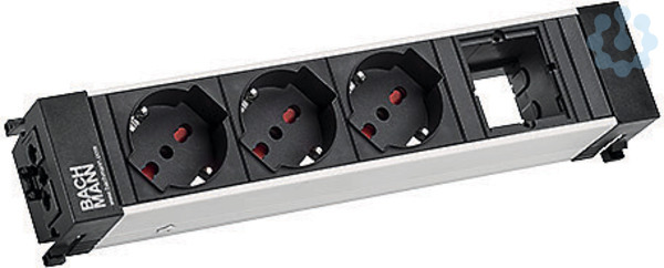 CONFERENCE Steckdoseneinheit ALU Länge: 260mm 3xP40 Italien 35° Steckdosen schwarz 1xCustom Module leer Stromeingang über Festleitung 0,2m H05VV-F 3G1,5mm² mit GST18i3 Stecker, Stromausgang über Buchse in Endkappe.