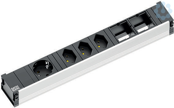 CONI Steckdoseneinheit ALU Länge: 6-fach / 355mm 1xSchutzkontaktsteckdose sw. 3xCH Steckdose sw. mit Thermosicherung 10A. 2xCustom Module leer Stromeingang: 0,20m H05VV-F 3G1,50mm² schwarz mit Wieland GST18 Steckverbinder. mit Bachmann LOGO. verpackt im Karton.