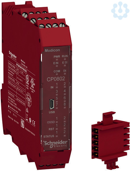 Preventa. Modularer Sicherheitscontroller PREVENTA XPSMCM. Modularer Sicherheitscontroller zur Realisierung von Sicherheitsanwendungen. CPU mit 8 sicheren digitalen Eingängen, 2x sichere OSSD-Ausgangspaare und 2 Diagnoseausgänge. Konfiguration durch den Anwender mit kostenlos verfügbarer Software SoSafe Configurable per USB-Anschluss. erweiterbar bis zu 14 Sicherheitsmodulen bis zu 128 Ein- und 16 Ausgänge. Aufbau zentral oder mit Kommunikationsmodulen bis zu 6 Inseln mit 50 m Abstand. Speicherkarte ja, optional. erreichbares Sicherheitsniveau bis Kat. 4, PL e, SIL 3. Querschlusserkennung an Ein- und Ausgängen. LED-Anzeige für Status, jeden Ein- und Ausgang. Baubreite 22,5 mm. Anschluss steckbare Schraubklemmen. Rückwand-Busstecker für Erweiterungsmodule beiliegend.