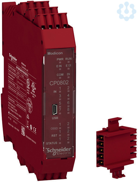 Preventa. Modularer Sicherheitscontroller PREVENTA XPSMCM. Modularer Sicherheitscontroller zur Realisierung von Sicherheitsanwendungen. CPU mit 8 sicheren digitalen Eingängen, 2x sichere OSSD-Ausgangspaare und 2 Diagnoseausgänge. Konfiguration durch den Anwender mit kostenlos verfügbarer Software SoSafe Configurable per USB-Anschluss. erweiterbar bis zu 14 Sicherheitsmodulen bis zu 128 Ein- und 16 Ausgänge. Aufbau zentral oder mit Kommunikationsmodulen bis zu 6 Inseln mit 50 m Abstand. Speicherkarte ja, optional. erreichbares Sicherheitsniveau bis Kat. 4, PL e, SIL 3. Querschlusserkennung an Ein- und Ausgängen. LED-Anzeige für Status, jeden Ein- und Ausgang. Baubreite 22,5 mm. Anschluss steckbare Federzugklemmen. Rückwand-Busstecker für Erweiterungsmodule beiliegend.