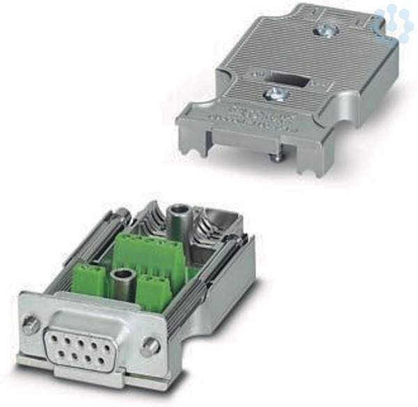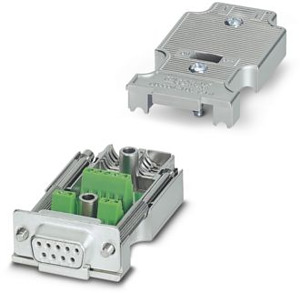 D-SUB-Stecker, 9-polige Buchse, axiale Ausführung mit zwei Kabelzuführungen, Universaltyp für alle Systeme, Pinbelegung: 1, 2, 3, 4, 5, 6, 7, 8, 9 auf Schraubanschlussklemme