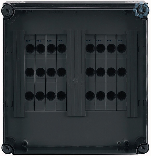 D02-Verteilergehäuse mit transparentem Deckel, 8x D02-Reiter-Sicherungssockel auf Sammelschienen-System 630A, 3-polig, Träger inklusive für N+PE zum Nachrüsten, mit CU-Schienen L1/L2/L3: 30 x 10 mm, N: ohne, PE: ohne, ohne Klemmen, Sicherungsgerät ohne Sicherungen und Schraubkappen.