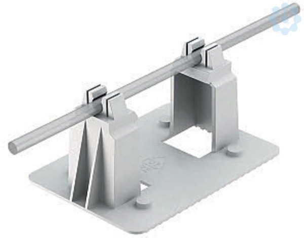 Dachleitungshalter für Rundleiter geeignet zum Einklemmen in Dachbahnstreifen. Bei der Installation von Rundleitern sind zum thermischen Ausgleich Dehnungselemente einzusetzen.