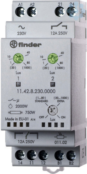 Dämmerungsschalter für DIN-Schiene, 1 Wechsler + 1 Schließer 12 A/250 V AC, max. Schaltleistungen bei 230 V AC: AC1 3000 VA, AC15 750 VA, Lampenlasten: Glüh- und Halogenlampen 2000 W, Energiesparlampen 400 W, LED (230 V AC) 400 W, NV-Halogenlampen oder LED mit EVG 400 W, NV-Halogenlampen oder LED mit KVG 800 W, Leuchtstofflampen mit EVG 1000 W, Leuchtstofflampen mit KVG 750 W, mit LED, 2 Einschaltschwellen: 1-80 Lux und 20-1000 Lux, Einbaubreite 35 mm, Spannungsversorgung: 230 V AC, Außensensor Typ 011.02 (IP 54) im Beipack enthalten.