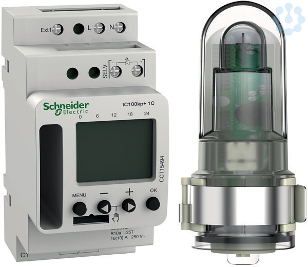 Dämmerungsschalter zur helligkeits- und zeitabhängigen Steuerung von Beleuchtungsanlagen. Die Beleuchtungsanlage wird eingeschaltet, sobald der eingestellte Helligkeitsschwellwert unterschritten wird oder die Zeitsteuerung das Schließen des Relais ermöglicht. Die Programmierung erfolgt am Gerät oder über die Smartphone App Acti 9 Light and Time Switch via Bluetooth Stick. Der Bluetooth Stick wird auch als Speicherkarte verwendet. Programmierbar auch über PC mittels Programmierkit CCT15860. CCT15494 Externer Eingang als Nebenstelle. Einstellbarer Schwellwert von 1-99.000 Lux. Verzögertes Ein- und Ausschalten einstellbar von 0 bis 5959 Minuten. Kurzanleitung im Aufbewahrungsfach. Für die Montage auf Hutschienen TH35. nach EN 60715. Funktionen -Ferienfunktion. Zeitlich begrenzte oder ständige Deaktivierung der Ein- und Ausschaltfunktionen. Automatische oder manuelle Umschaltung von Sommer-Winterzeit. Betriebsstundenzähler Anzeige der Betriebsstunden pro Kanal. Daueranzeige auf dem LCD-Display von Stunde und Minu