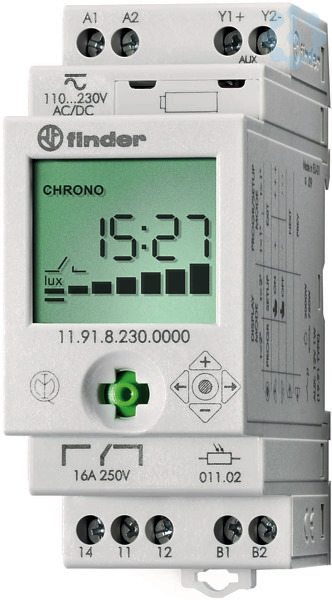 Dämmerungsschalter + Zeitschaltuhr für DIN-Schiene, 1 Wechsler 16 A/250 V AC, max. Schaltleistungen bei 230 V AC: AC1 3000 VA, AC15 750 VA, Lampenlasten: Glüh- und Halogenlampen 2000 W, Energiesparlampen 400 W, LED (230 V AC) 400 W, NV-Halogenlampen oder LED mit EVG 400 W, NV-Halogenlampen oder LED mit KVG 800 W, Leuchtstofflampen mit EVG 1000 W, Leuchtstofflampen mit KVG 750 W, mit LED, Einschaltschwelle: 1-150 Lx, Einbaubreite 35 mm, Spannungsversorgung: 230 V AC, Außensensor Typ 011.02 im Beipack enthalten, Zubehör: Powermodul Typ 19.91.9.012.4000