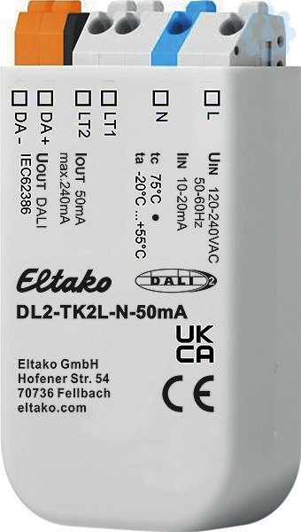 Kompaktes DALI-2 Steuermodul mit 2 frei programmierbaren Schalteingängen. Für Einbaumontage. 59mm lang, 33mm breit, 15mm tief. Schutzart: IP 20. DALI-2 zertifiziert. DALI2 ist die neuste Generation des DALI-Standard mit erweitertem Funktionsumfang. DALI2-Geräte beherrschen auch alle bisherigen DALI-Funktionen und sind somit abwärtskompatibel. Kompaktes DALI-2 Steuermodul mit 2 Schalteingängen für 230V AC. Mit integrierter DALI Busversorgung (50mA), eine zusätzliche Busversorgung darf nicht angeschlossen werden. Galvanische Trennung zwischen Schalteingang und DALI-Interface. Multimasterfähig. Integrierter DALI-2 Application Controller. Jedem Eingang können individuelle DALI-Befehle, Wirkbereich und Schaltfunktionen zugeordnet werden. Der Application Controller ermöglicht neben den Standard DALI Befehlen auch DALI DT8 TC und RGB(W) Steuerung. Einfache Integration durch zwei DALI2 Pushbutton Instanzen. Unterstützt kurzen Tastendruck, langen Tastendruck (mit Wiederholung für dimmen und Toggle. Neben Taster auch f