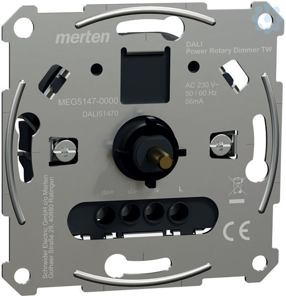 Der DALI Power Dimmer für Merten System M und System Design ermöglicht die Steuerung von Leuchten mit DALI-Schnittstelle (DT8). Die Bedienoberfläche ist ein Dreh-/Druckknopf und ermöglicht das Schalten und Dimmen von Leuchten mit DALI-Schnittstelle. Der DALI Power Dimmer bietet die Funktionalität zum Schalten und Dimmen von Leuchten mit DALI-Schnittstelle (DT8). Er ermöglicht die Veränderung der weißen Farbtemperatur (tunable white) mit DALI Devices Type 8 gemäß IEC 62386-209. Die Farbtemperatur kann zwischen 2000-10000K eingestellt werden. Der DALI-Dimmer kann die Einschalthelligkeit oder eine minimale Helligkeit speichern. Der DALI-Dimmer wird genauso einfach installiert wie ein Standard-Dimmer. Der Dimmer liefert den Steuerstrom für 28 DALI-Teilnehmer. Parallelschaltung von bis zu 4 DALI-Dimmern mit Netzgerät mit der Möglichkeit, bis zu 112 DALI-Teilnehmer zu versorgen. Die Nennspannung beträgt AC 230V bei 50/60Hz. Der Ausgangsstrom beträgt max. 56mA. Die maximale Leistungsaufnahme des DALI-Dimmers beträgt