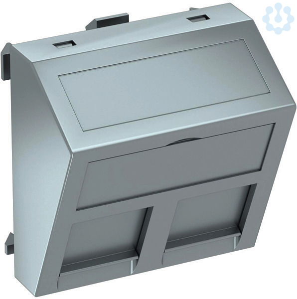 Datentechnikträger mit schrägem Auslass und Verschlussschieber zur Aufnahme von zwei Datentechnik-Anschlussmodulen mit RJ45-Buchse. Die Rastbefestigung eignet sich für den waagerechten und senkrechten Einbau in die Systemumgebung. Typ RM hat eine spezielle Modulaufnahme und ist für eine indirekte Befestigung der Daten-Anschlussmodule in der Montageöffnung ausgelegt.