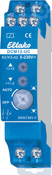 DC-Motorrelais. Stand-by-Verlust nur 0.07 Watt. 1 Teilungseinheit. Die DCM12-UC können parallel betrieben werden, benötigen jedoch freie Kontaktausgänge K2/K3 des steuernden EGS12Z-UC. Diese werden mit den Klemmen K2/K3 des DCM12-UC verbunden. Mit einem Drehschalter können die Funktionen Auf oder Ab gesperrt werden und kann ganz ausgeschaltet werden. Diese Sperre gilt nur für den einen angeschlossenen Motor. Damit können einzelne Beschattungselemente oder Rollläden von der Automatikfunktion einer Gesamtsteuerung ganz oder teilweise ausgenommen werden.