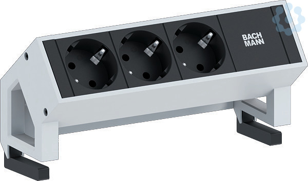 DESK2 Steckdosenleiste weiß lackiert RAL 9010 Glanzgrad 30. mit erhöhtem Berührungsschutz 3xSchutzkontaktsteckdosen schwarz Zuleitung 0,2m H05VV-F3G1,5mm² schwarz mit GST18i3 Stecker inkl. Haltewinkel mit Bachmann Logo verpackt im Karton