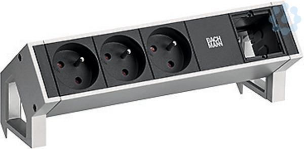 DESK2 ALU Steckdoseneinleiste INOX 3xUTE Steckdosen Frankreich mit erhöhtem Berührungsschutz 1xCustom Modul leer Zuleitung 0,2m H05VV-F3G1,5mm² schwarz mit GST18i3 Stecker mit Bachmann Logo inkl. Haltewinkel. verpackt im Karton